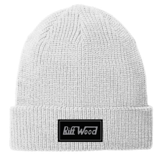 Chunky Knit beanie with wide cuff and leatherette patch. One size fits most.